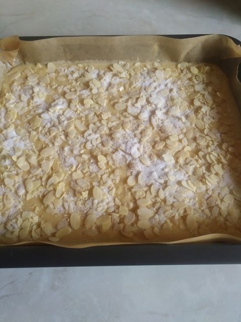 und glatt streichen. Die mit dem Zucker vermischten Mandeln auf der Teigmasse verteilen.