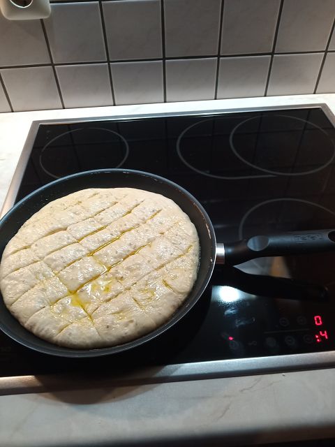 Die Pfanne (28cm) mit einem Esslöffel Olivenöl einfetten und den Teig hinein legen. Nun ein typisches Karomuster,