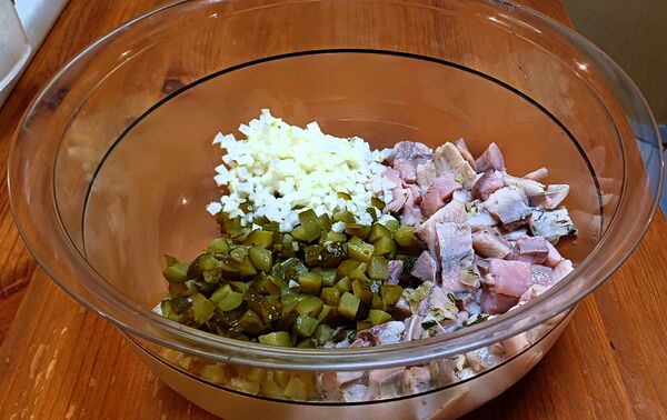 Zwiebeln und Gurken würfeln, Matjes in 1x1 cm große Stücke schneiden. Danach alles in einer großen Schüssel
