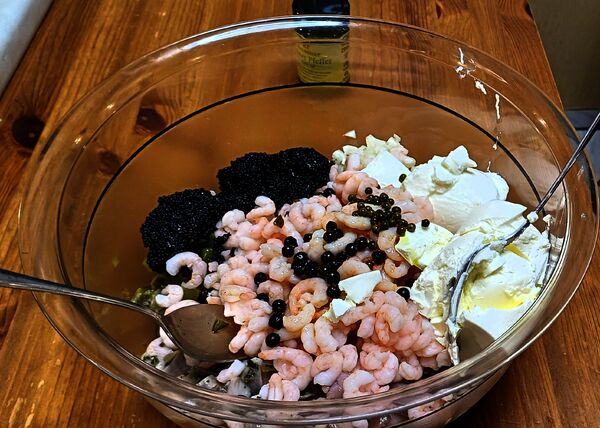 mit Krabben und Kaviar vermischen. Aus Essig, Öl, grünem Pfeffer, Wacholderbeeren, Sahne und Schmand eine Salatsauce