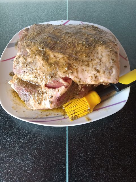 Marinade erstellen. Die trockene Lammkeule mit dieser Marinade einstreichen und 60 Minuten ruhen lassen.