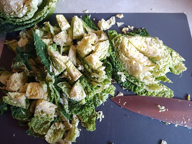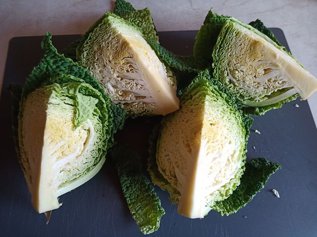 Die äußeren Blätter vom Wirsing lösen und entfernen (z.B. in den Hasenkäfig) Nun den Wirsing vierteln und an