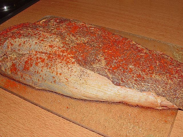 Den Rinderbraten mit Senf bestreichen und mit Salz, Pfeffer und Paprikapulver würzen.