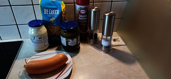 Nudeln in einer großen Schüssel geben, die Fleischwurst und die Gurken hinzufügen. Alles zusammen mit dem Mayonnaise Mix verrühren.