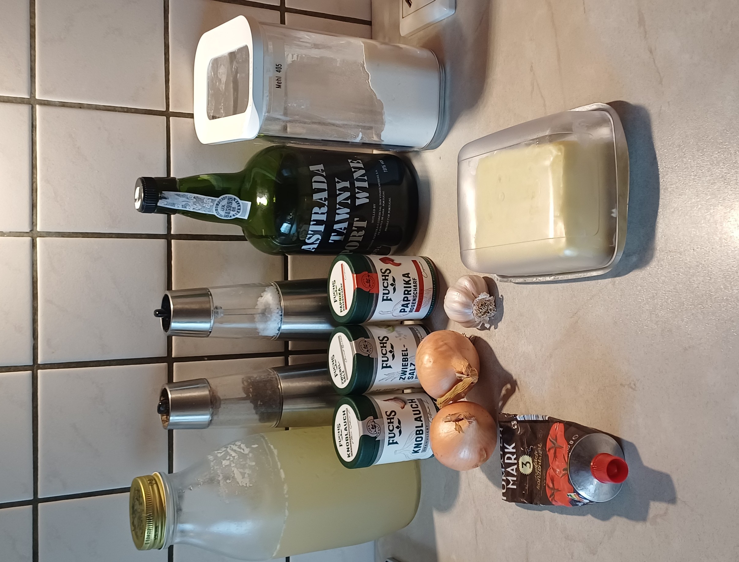Mit Portwein ablöschen und etwas einkochen lassen. Gemüsebrühe und evtl. das Lorbeerblatt dazugeben.
