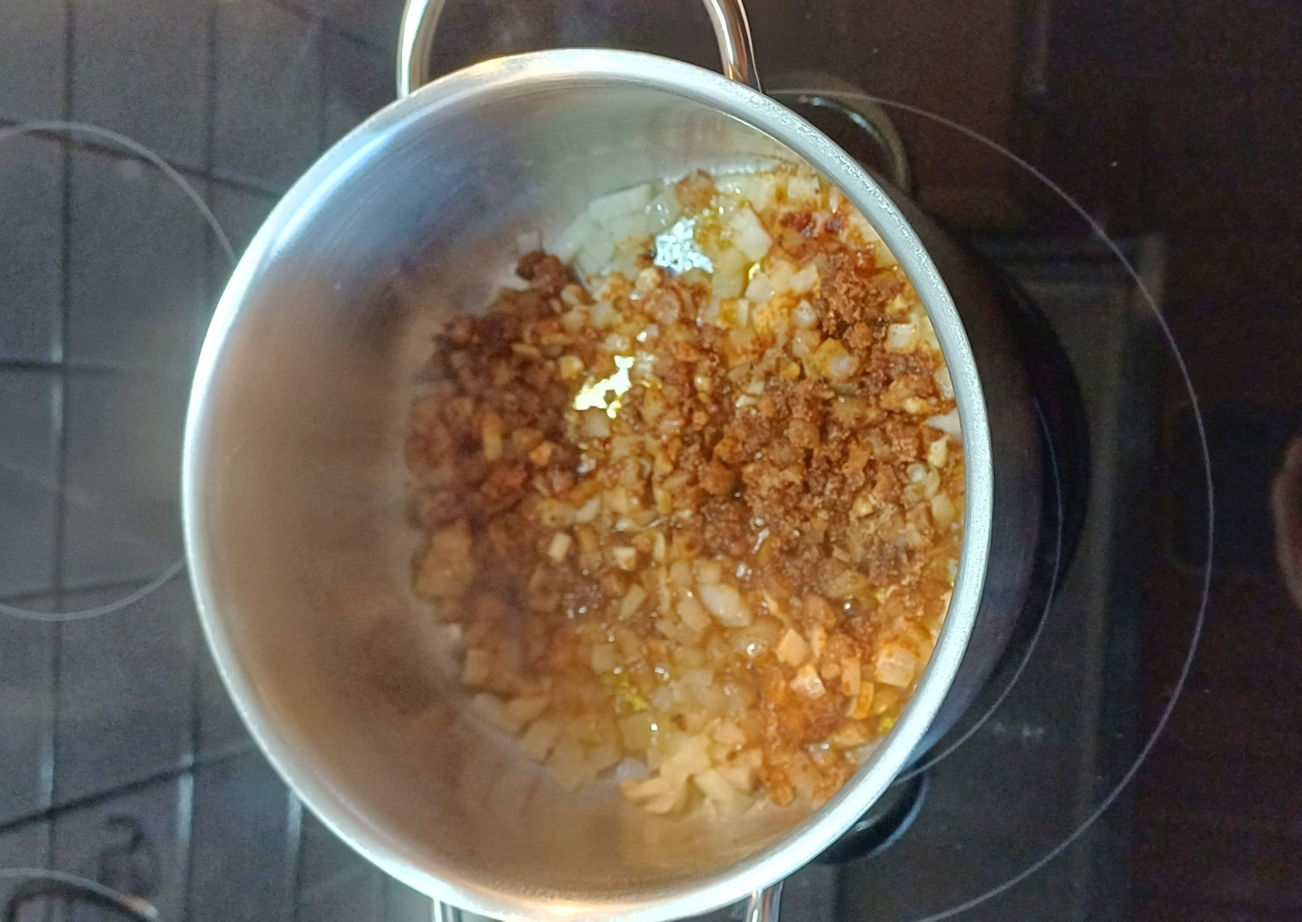 Butter in einem Topf erhitzen und die Zwiebelstücke darin anschwitzen. Den Knoblauch gepresst und die