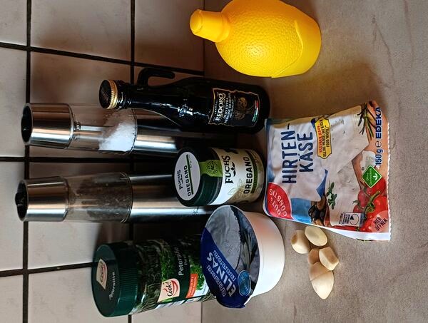 Ziehe den Knoblauch ab und gib ihn gepresst zum Feta.
