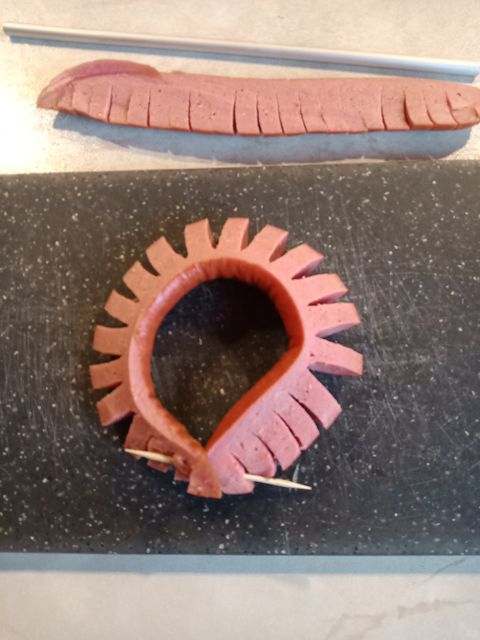Länge nach durchtrennt (Bild 4). Die Rinderwürstchen können nun vorsichtig zu einer Krone gebogen und die Enden