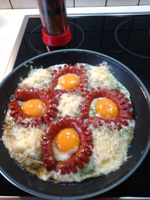 Die Rinderwürstchen in der Pfanne umdrehen und jeweils mittig in den Wurstring ein Eigelb füllen. Das Eigelb sollte