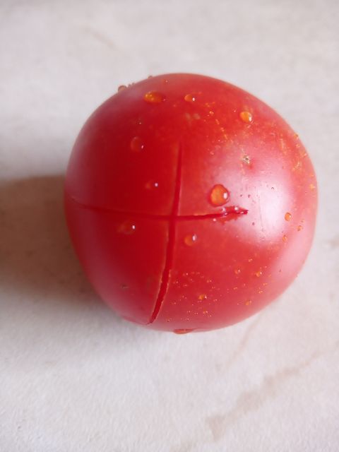 Unterseite überkreuz einschneiden und mit kochendem Wasser übergießen.