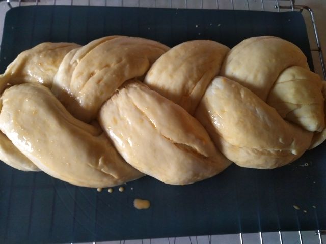 Nach Erreichen der Temperatur den Zopf mit dem Eigelb bestreichen und und in den Backofen (unter Schiene) geben.