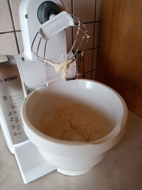 Mit einem kleinen Schneebesen in der Küchenmaschine zu einem geschmeidigen Teig verrühren. Der Teig ist sehr