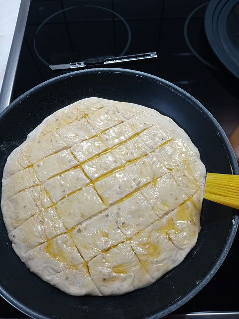 Die Pfanne (28cm) mit einem Esslöffel Olivenöl einfetten und den Teig hinein legen. Nun ein typisches Karomuster,
