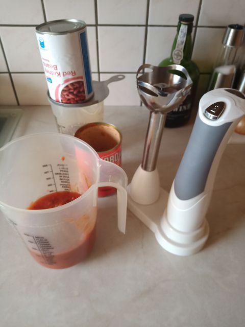 einem Stabmixer zerkleinern. Den Rotwein / Portwein hinzugeben. Die Flüssigkeit der Kidney Bohnen abschütten.