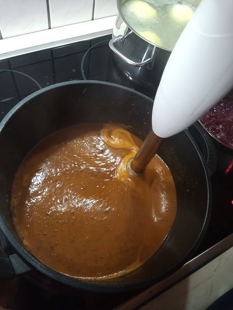 Nach Ablauf der Schmorzeit das Fleisch aus dem Topf nehmen. Den Topf wieder auf den Herd stellen und einmal aufkochen lassen.