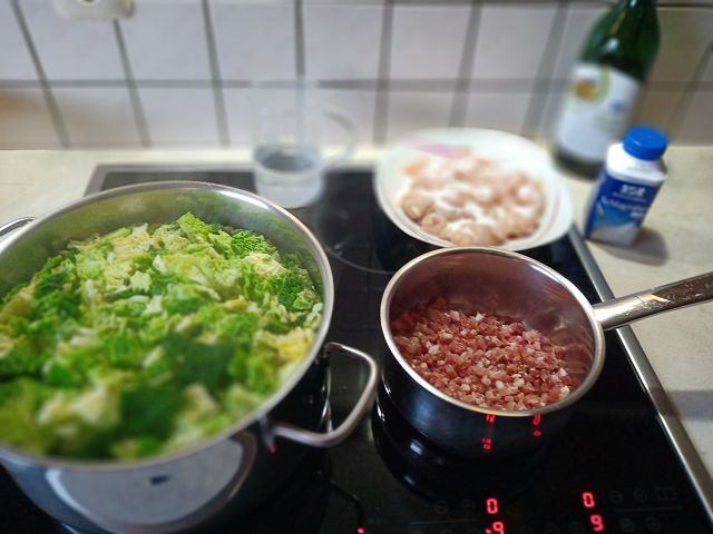 Den Wirsing dazugeben, einen Teelöffel Thai Red Curry Paste und den Katenschinken unterrühren und weitere 5 Minuten mitdünsten lassen. Den Weißwein dazugeben und auf die Hälfte reduzieren lassen. Bei mittlerer Hitze dauert das ungefähr 10 Minuten. Jetzt die Sahne hinzugeben, mit Salz und Pfeffer würzen und bei mittlerer Hitze ca. 5 Minuten reduzieren lassen.