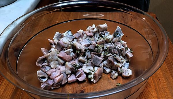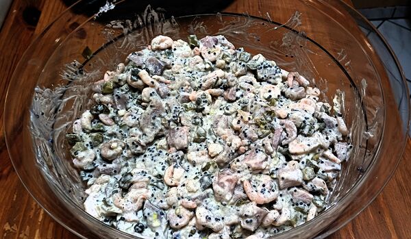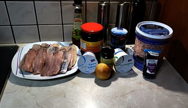 • Zwiebeln und Gurken würfeln, Matjes in 1x1 cm große Stücke schneiden. Danach alles in einer großen Schüssel mit Krabben und Kaviar vermischen. Aus Essig, Öl, grünem Pfeffer, Wacholderbeeren, Sahne und Schmand eine Salatsauce zubereiten. Alles miteinander vermischen. Mit Paprika und Fondor abschmecken. Mindestens einen Tag ziehen lassen.