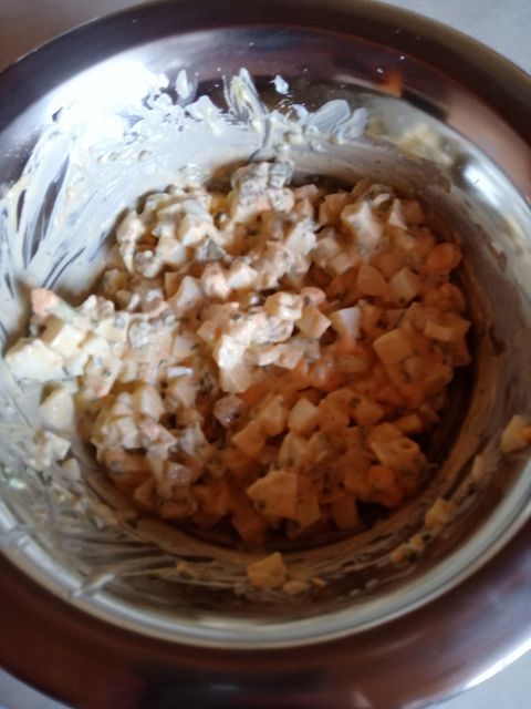 Stücke schneiden. Alles in eine Salatschüssel geben und mit dem Löwensenf und der Remoulade gut vermischen.