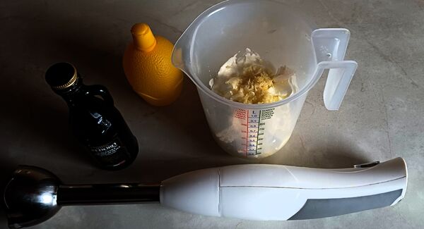 Füge Joghurt, Olivenöl und Zitronensaft hinzu und verrühre alle Zutaten miteinander. Püriere die Masse mit einem Pürierstab glatt.